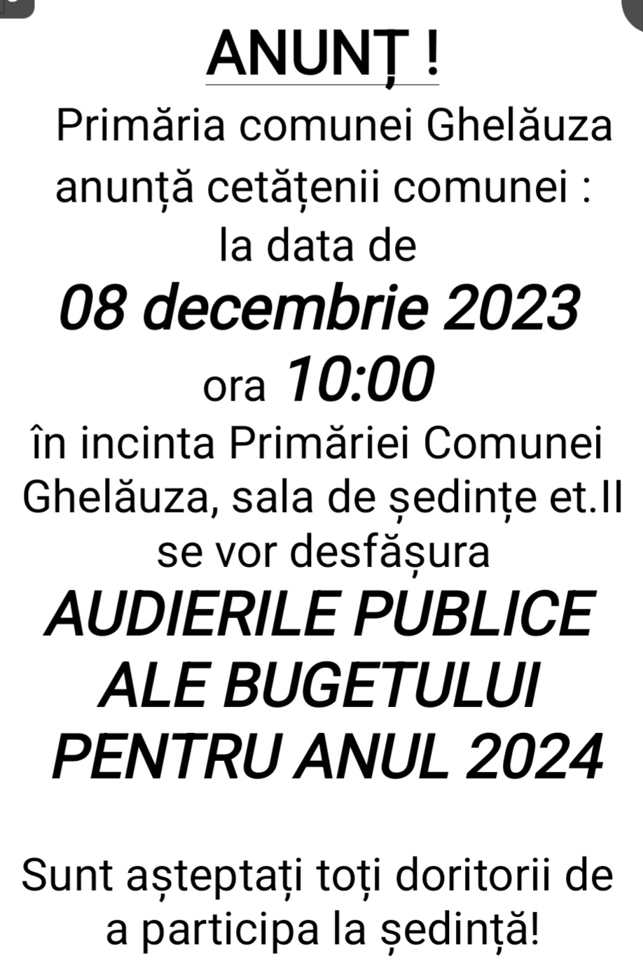 ANUNȚ AUDIERI PUBLICE ALE BUGETULUI PENTRU ANUL 2024